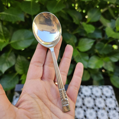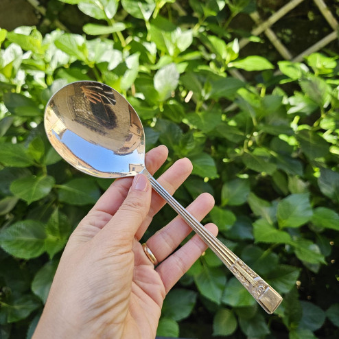 I manici presentano una decorazione lineare di gusto classico, con motivi stilizzati nella parte terminale che richiamano il gusto elegante della produzione inglese di metà Novecento. La superficie argentata conserva una bella lucentezza, valorizzando la semplicità e l’equilibrio del disegno.