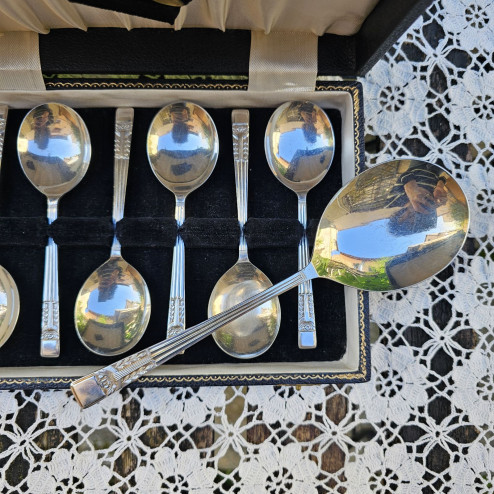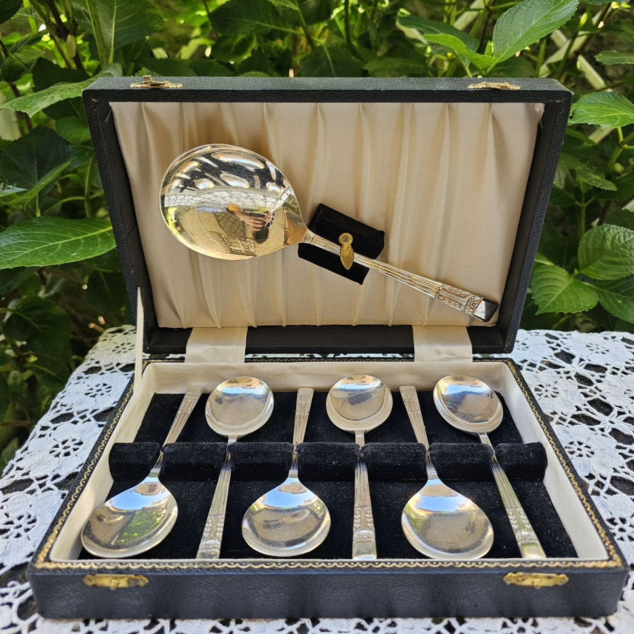 Elegante set inglese di cucchiai da dolce in sheffield plate prodotto da Arlington Plate nel 1953. Il servizio comprende sei cucchiai e un cucchiaio di servizio, conservati nella scatola originale. Lunghezza cucchiai 14 cm, cucchiaio di servizio 22,5 cm. Buone condizioni generali con lievi segni del tempo.