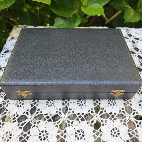 Il servizio è custodito nella scatola originale, rivestita all’esterno in similpelle nera con chiusure metalliche e all’interno con rivestimento in tessuto chiaro e velluto scuro sagomato per accogliere i cucchiai.