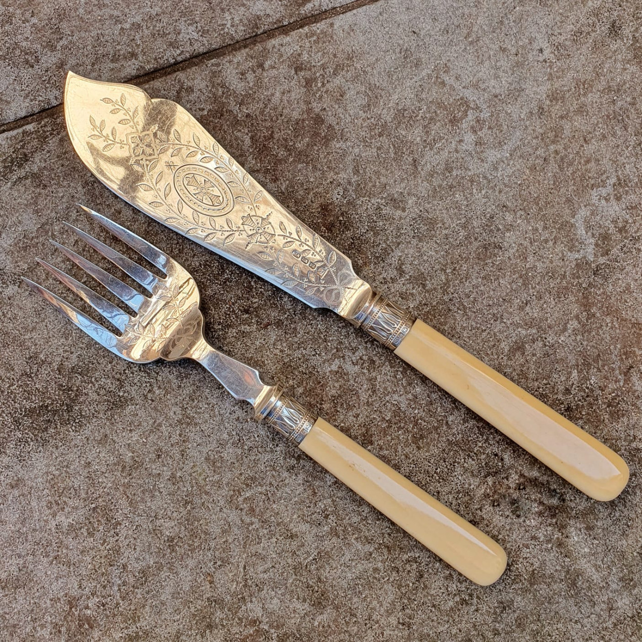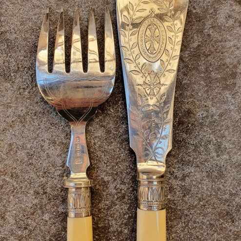 Elegante set da servizio per il pesce, prodotto in Inghilterra da Atkin Brothers alla fine dell’Ottocento.