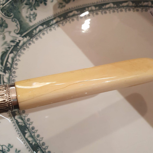 La fascetta in argento con decori cesellati unisce il manico in resina color avorio, conferendo armonia ed equilibrio al design.