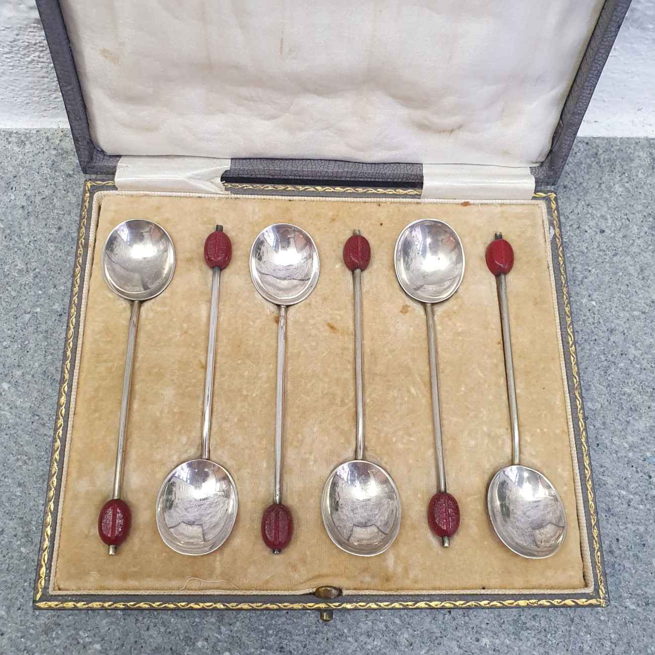 I cucchiaini di questo set, venduti nella scatola originale, sono caratterizzati dalla presenza di un chicco di caffè in bachelite rossa all'estremità del manico sottile.