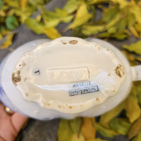 Il pezzo è decorato con il motivo Mabelle, un elegante decoro floreale di gusto tardo vittoriano, realizzato in blu su fondo chiaro. Il disegno presenta un leggero effetto flow blue, che ammorbidisce i contorni e dona profondità al decoro, affiancato da delicati elementi a rilievo che arricchiscono la superficie.