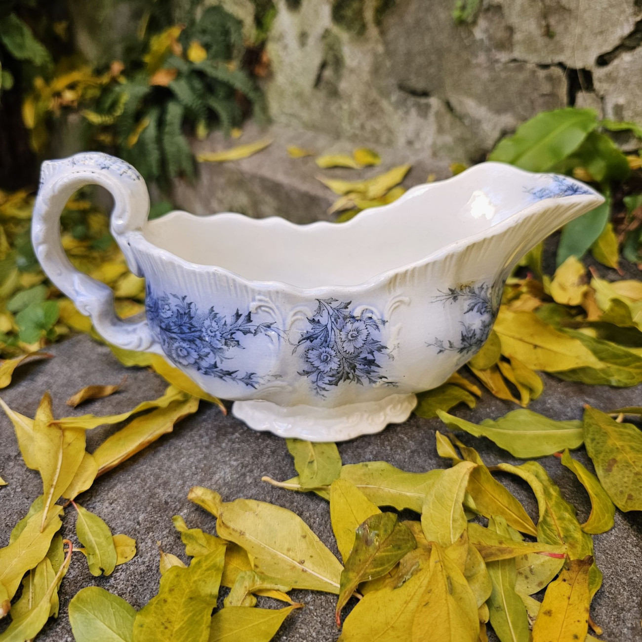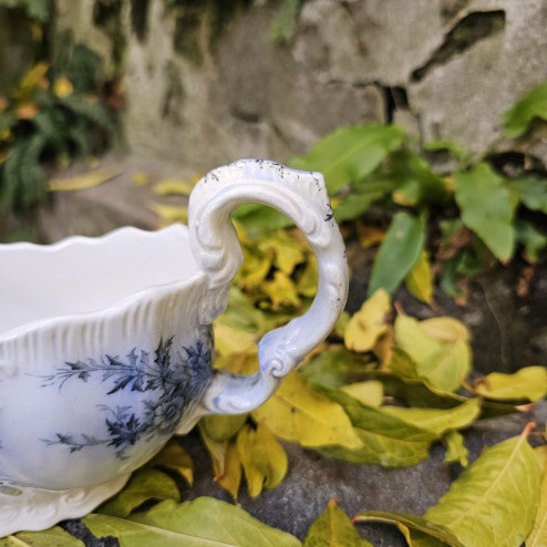 Questa raffinata salsiera a barca è un bell’esempio di ceramica inglese di fine Ottocento, prodotta da Burgess & Leigh, storica manifattura attiva a Burslem, nello Staffordshire.