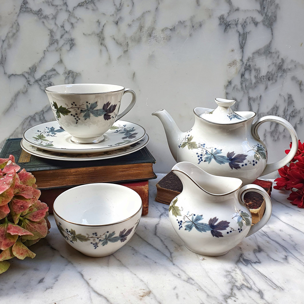 Tazze inglesi da tè con doppio piattino (dette anche trio), in porcellana fine bone china prodotte negli anni '20. Le tazze hanno una bellissima forma a spirale la porcellana è sottile e trasparente alla luce. Il colore predominante del decoro è senza dubbio il rosso, mentre i punti del disegno più scuri sono di un profondo blu cobalto, mentre alcuni piccoli fiorellini color turchese che creano un contrasto.