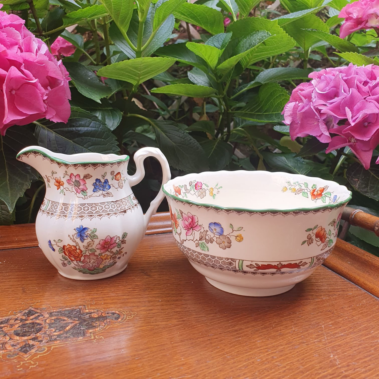 Set lattiera e zuccheriera Copeland Spode (1926–1948) nel celebre pattern "Chinese Rose", con raffinato decoro floreale e profilo verde. Ottime condizioni vintage.