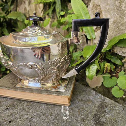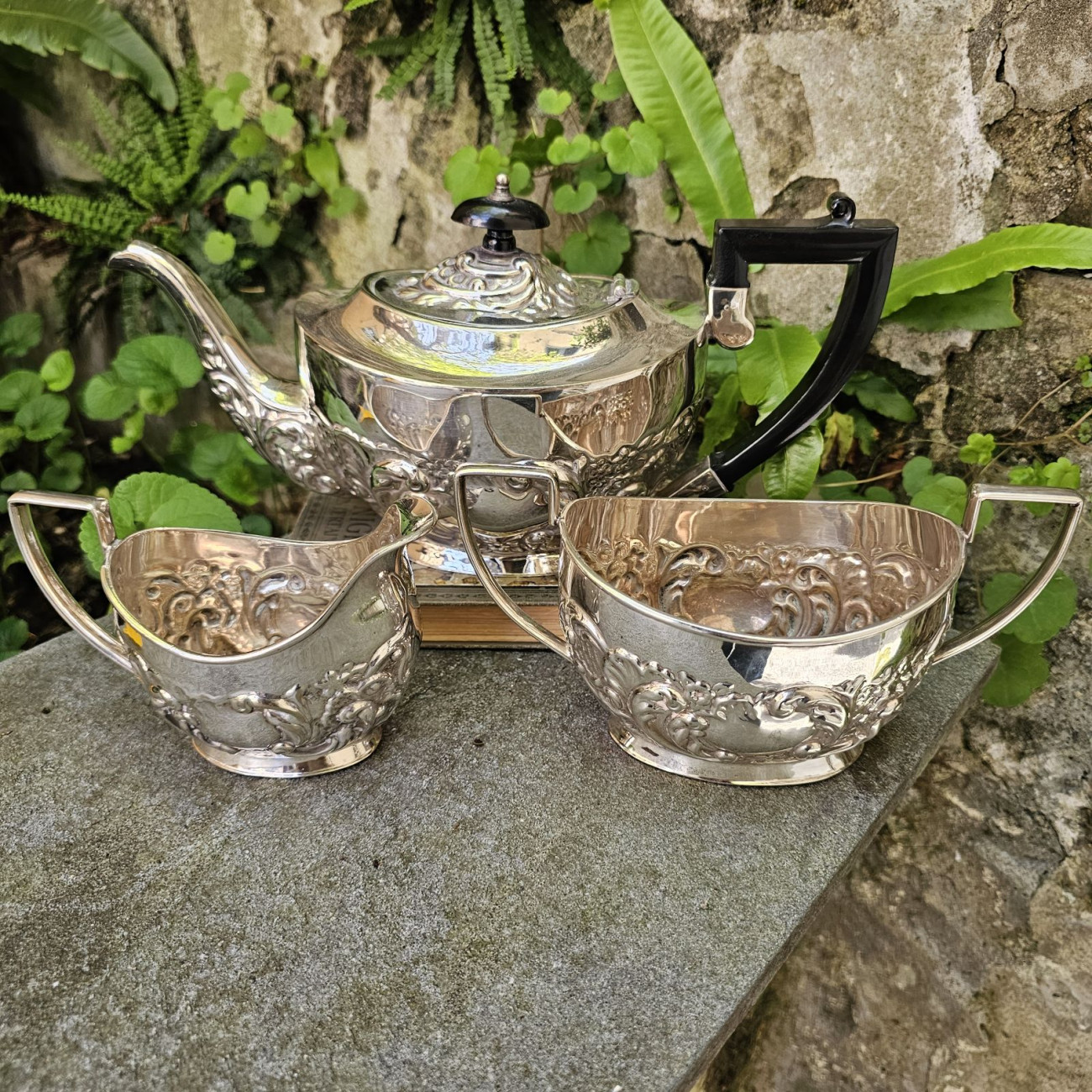 Elegante servizio da tè inglese in sheffield plate composto da teiera, lattiera e zuccheriera, databile agli anni ’50. I pezzi sono decorati a sbalzo con motivo repoussè e rifiniti a mano. Manico e pomello in resina nera. Ottime condizioni anche internamente. Lunghezza teiera (manico-beccuccio) 30 cm.