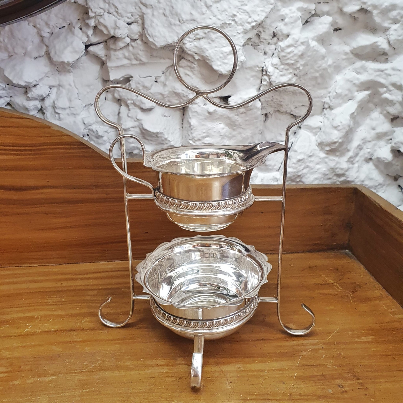 Elegante set su stand composto da lattiera e zuccheriera, tutto in sheffield plate.
