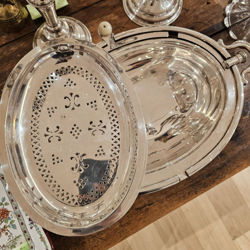 Il metallo è lavorato con bella cura dei dettagli: le gambe slanciate, i manici laterali sagomati e il bordo scanalato donano al pezzo una presenza importante in tavola, pur mantenendo un’eleganza sobria tipicamente britannica.