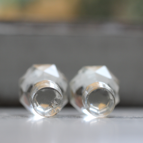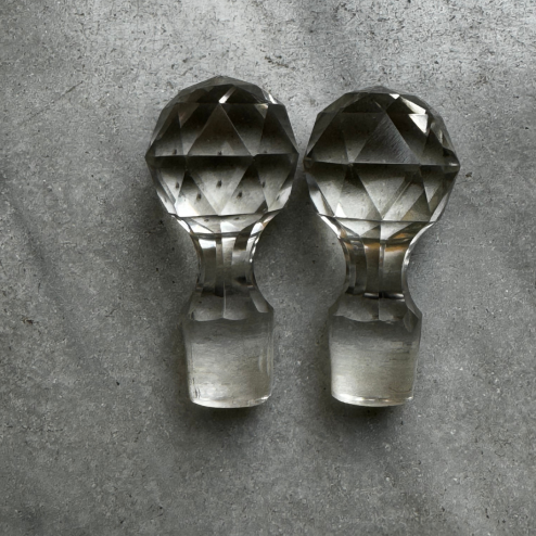 Le boccette , di una bella forma slanciata, sono in cristallo sfaccettato, con i 2 tappi a prisma.