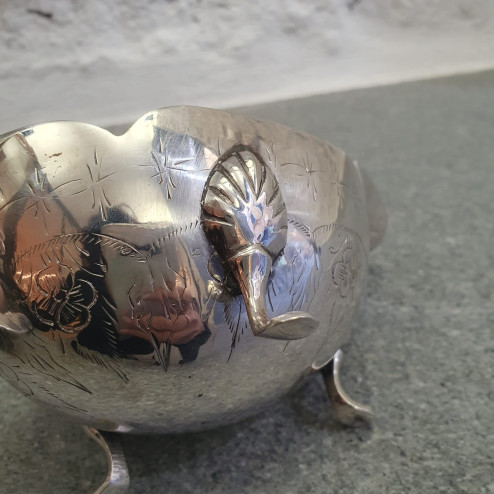 I tre piedini sono slanciati, mentre il manico forma un arco arricciolato. Il bordo è mosso, dettaglio tipico dell'epoca, mentre la pancia è decorata da un disegno inciso a mano di fiori.