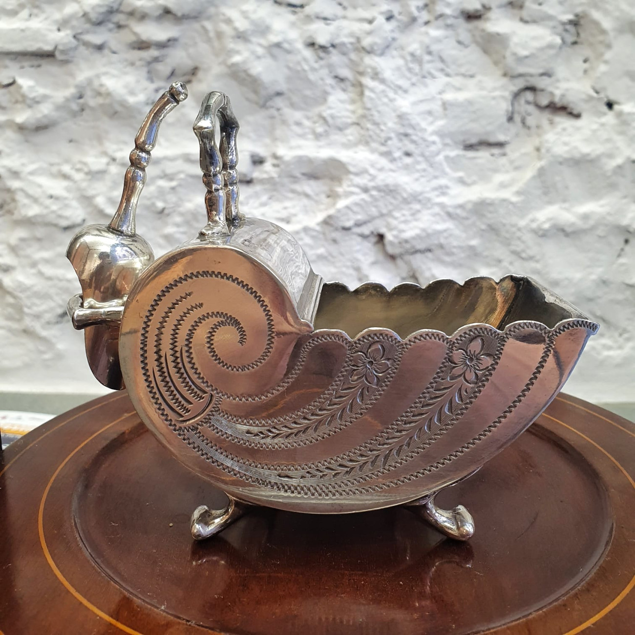 Zuccheriera inglese edoardiana in sheffield plate, forma a conchiglia con piedini, incisioni a mano e supporto posteriore con cucchiaino originale incluso.