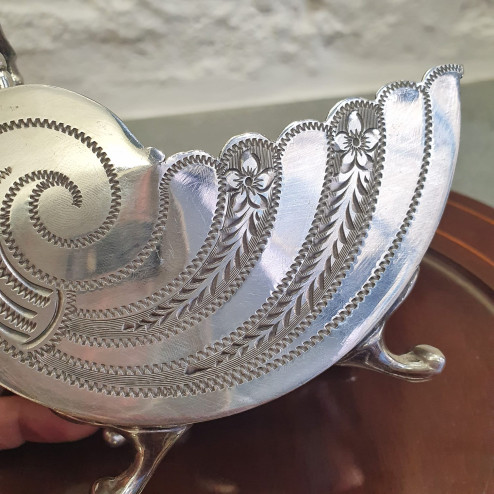 La sua originale forma a conchiglia, con quattro piedini rialzati e ricchi dettagli incisi a mano, la rende un raffinato esempio di artigianato inglese.