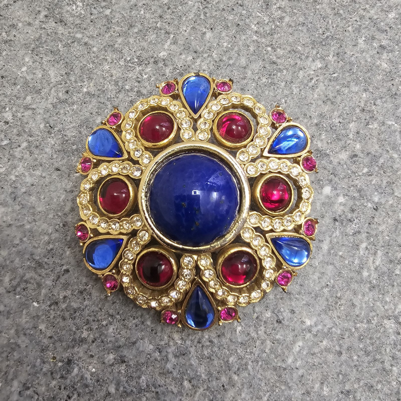 Spilla inglese Sphinx anni ’70 in metallo dorato con gemma centrale in pasta di vetro blu, strass brillanti trasparenti e cabochon rossi e azzurri. Con leggere scoloriture.