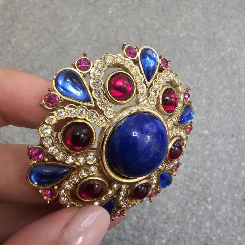 Al centro spicca una gemma in pasta di vetro blu dal taglio rotondo, incorniciata da una corona di piccoli strass trasparenti taglio brillante. Completano la composizione altri strass più grandi, nei toni del rosso e dell’azzurro, tagliati a cabochon e disposti con simmetria.