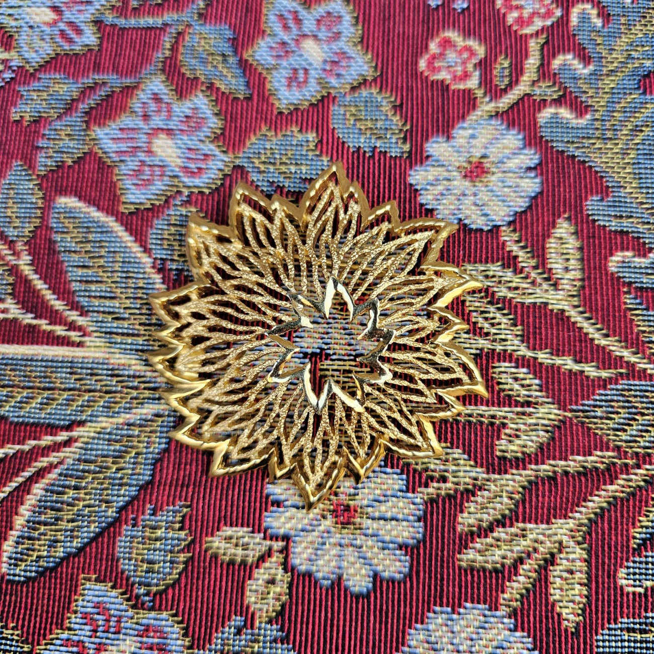 Spilla Trifari anni ’60 in lega metallica dorata lucida e satinata, con motivo floreale traforato. Firma Trifari sul retro.