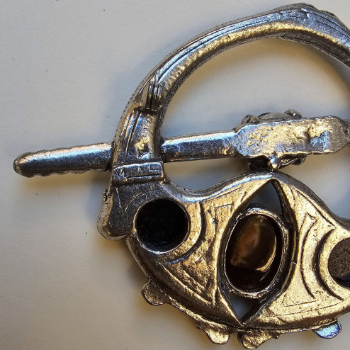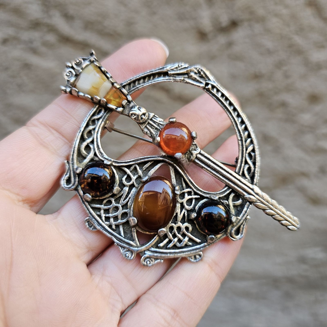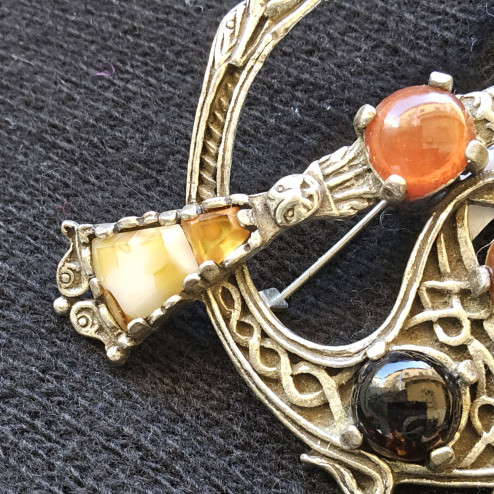 La spilla è realizzata in metallo color argento con un ricco decoro traforato a intrecci, tipico dell’iconografia celtica. Al centro e lungo la struttura sono incastonate pietre in pasta di vetro in varie gradazioni di ambra—dall’arancio più caldo ai bruni profondi—che imitano alla perfezione il fascino delle gemme naturali.