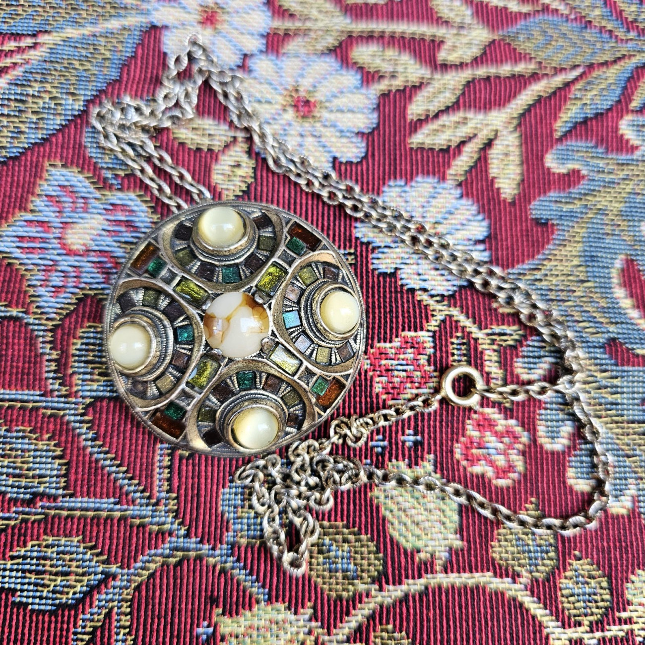 Splendido ciondolo–spilla scozzese vintage degli anni ’60, firmato Miracle, marchio britannico celebre per i suoi gioielli ispirati all’arte celtica e ai disegni medievali.