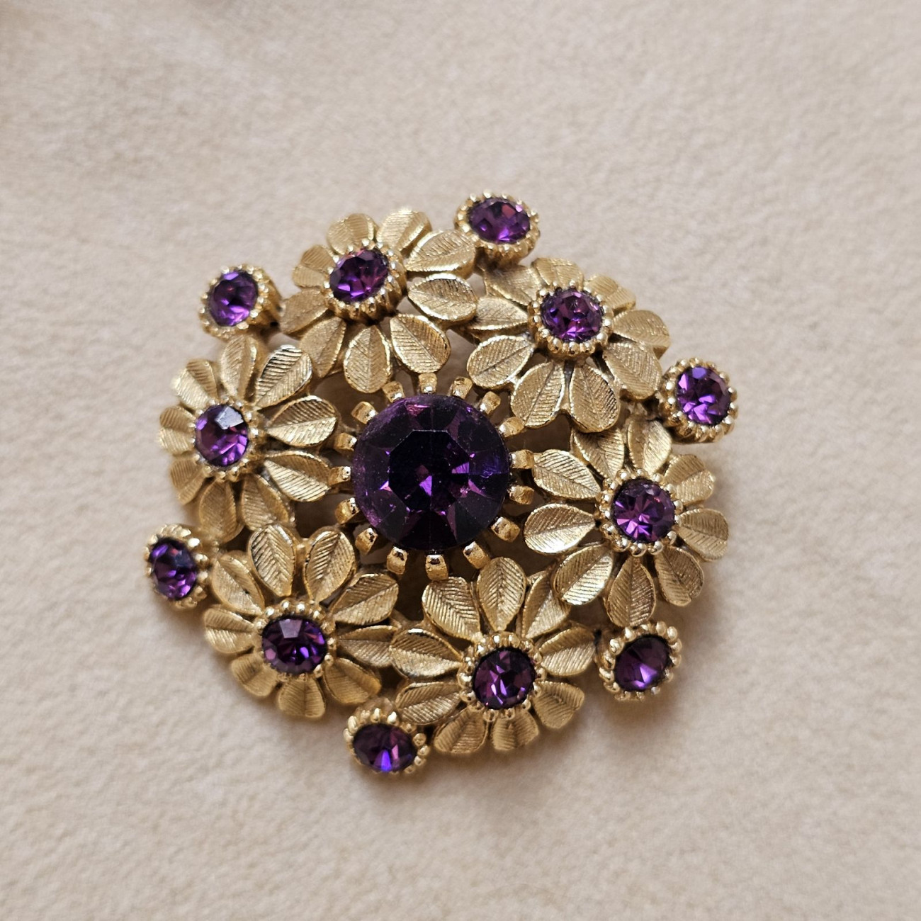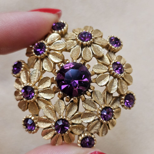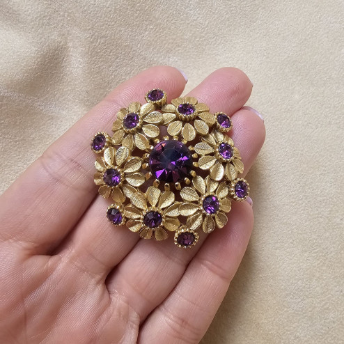 La spilla è realizzata in lega metallica dorata finemente lavorata e presenta una raffinata composizione floreale circolare. Il disegno è costruito come una corolla, con una pietra centrale viola di dimensioni maggiori, incastonata a griffe, circondata da strass viola sfaccettati di varie dimensioni, che creano profondità, ritmo e un bell’effetto luminoso.