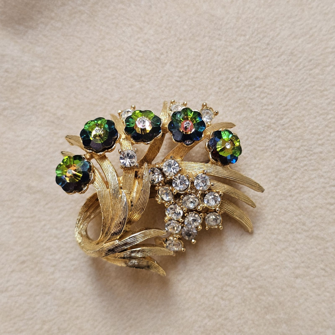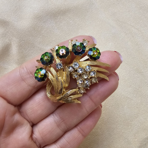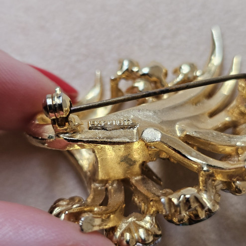 La spilla è in ottime condizioni generali, con chiusura funzionante e pietre ben salde. Un accessorio ideale sia per chi colleziona bigiotteria firmata americana, sia per chi desidera indossare un gioiello vintage capace di dare carattere anche a un look contemporaneo.