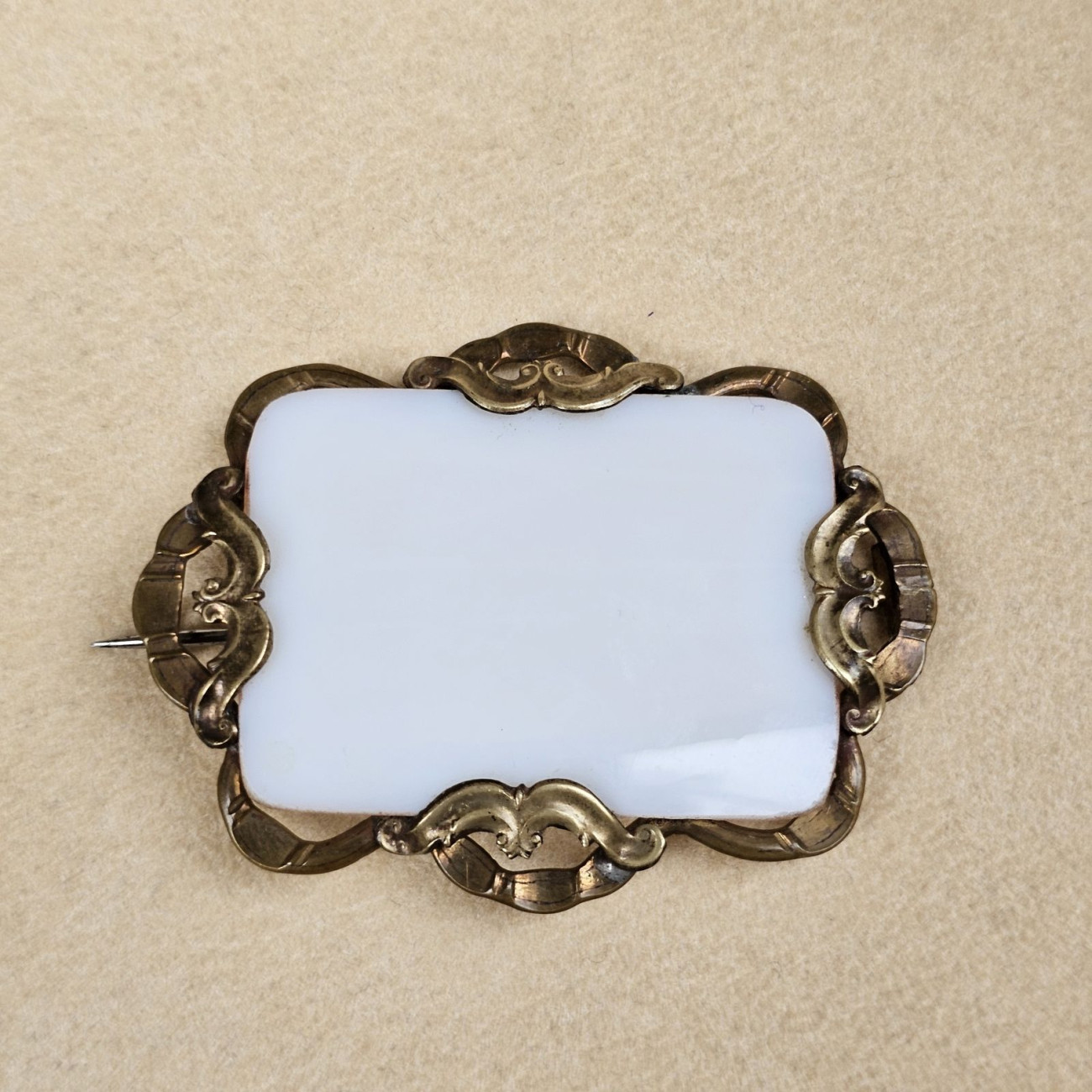 Raffinata spilla vittoriana inglese risalente al XIX secolo, realizzata in pinchbeck e impreziosita da una sottile lastra di agata bianca, perfettamente conservata.