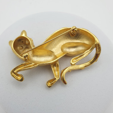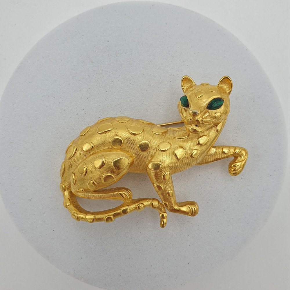 Particolare spilla americana, prodotta negli anni '60 dalla famosa maison Trifari, dedicata a tutti gli amanti dei gatti! La spilla rappresenta un ghepardo accucciato, con una zampina anteriore alzata, il muso attento dove spiccano due occhi formati da brillanti strass verde smeraldo; la lunga coda si snoda sinuosa e il corpo é coperto da macchie in rilievo. Quasi una piccola scultura da appuntare ai vostri abiti! La spilla fa parte della serie Ark, molto ricercata dai collezionisti. In metallo dorato, ha una finitura lucida e opaca. Le condizioni sono ottime.