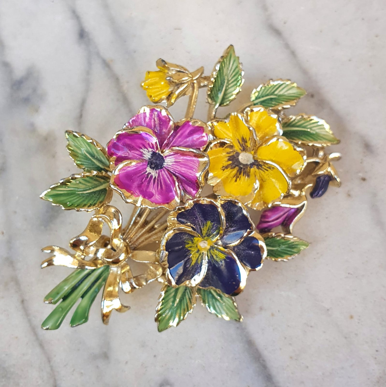 La spilla è in lega metallica smaltata a mano e rappresenta un mazzolino di viole del pensiero di tre colori diversi.
