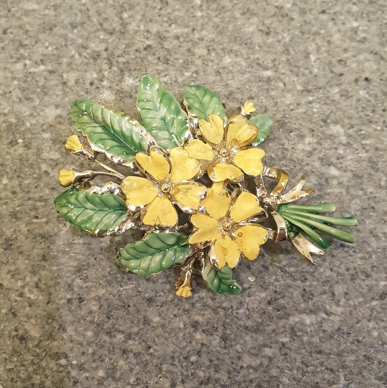 La spilla è in lega metallica smaltata a mano e rappresenta un mazzolino di primule gialle.