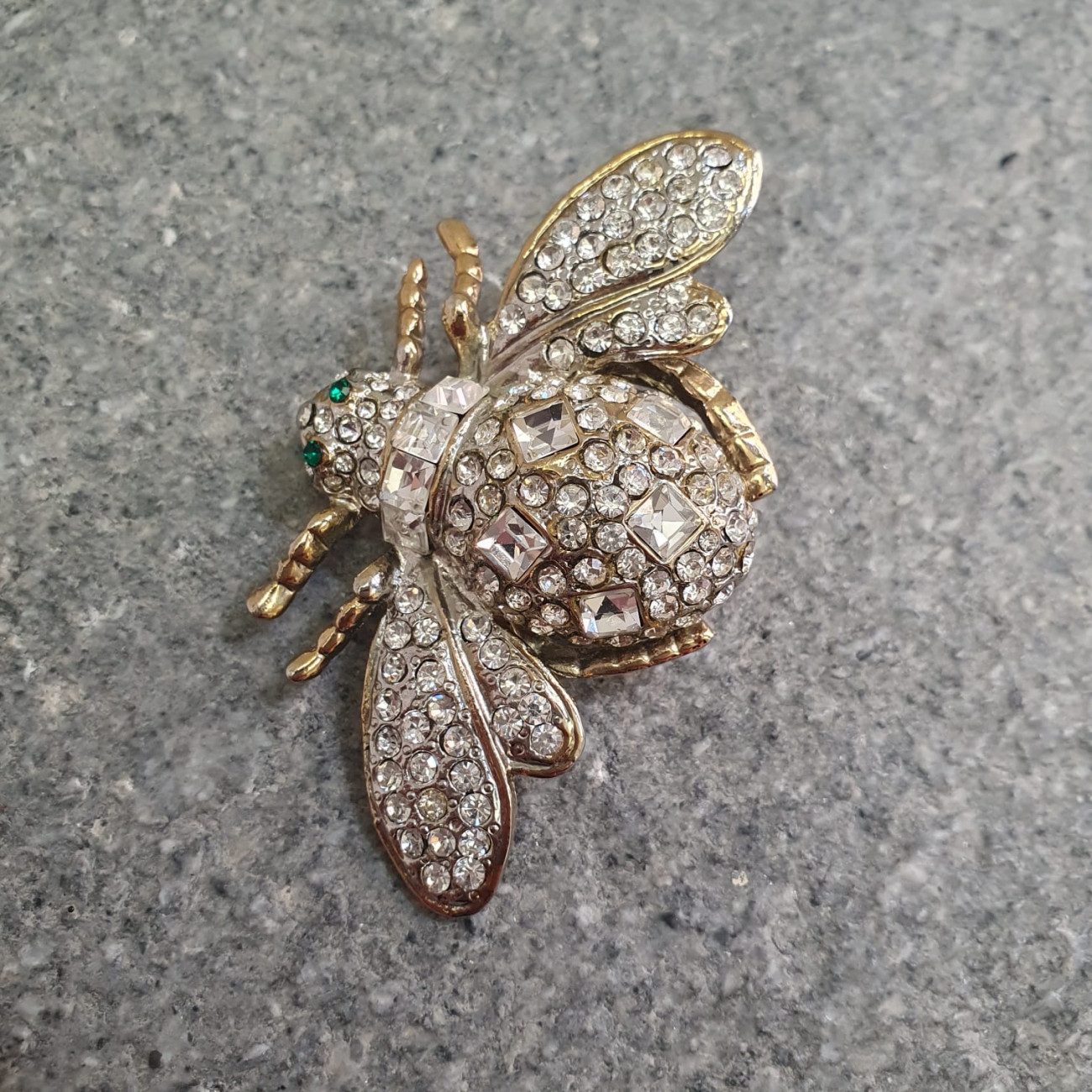 Spilla vintage anni ’70 a forma di grande ape in metallo dorato, decorata con piccoli e grandi strass trasparenti. Occhi verde smeraldo.