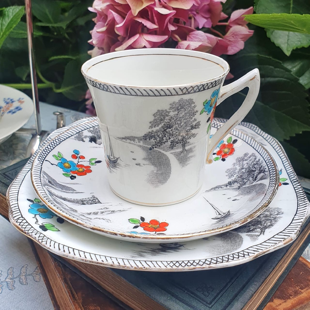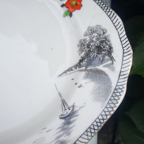 Il decoro è un delizioso connubio tra l’eleganza del paesaggio tracciato in monocromo e il tocco giocoso dei fiori smaltati in colori vivaci: rosso corallo, turchese, verde e arancio. I bordi sono finemente tratteggiati e la forma della tazza, leggermente svasata, è tipica del periodo. Molto grazioso l'effetto dei due piattini, con il saucer rotondo e il piattino da dolce quadrato.