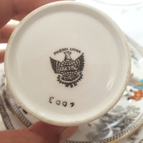 Questo raffinato trio da tè inglese, composto da tazza, piattino da tè e piatto da dolce, è firmato Thomas Forester & Son, uno dei più noti produttori di porcellane di Longton (Staffordshire), attivo sotto il marchio Phoenix China tra il 1912 e il 1959.
