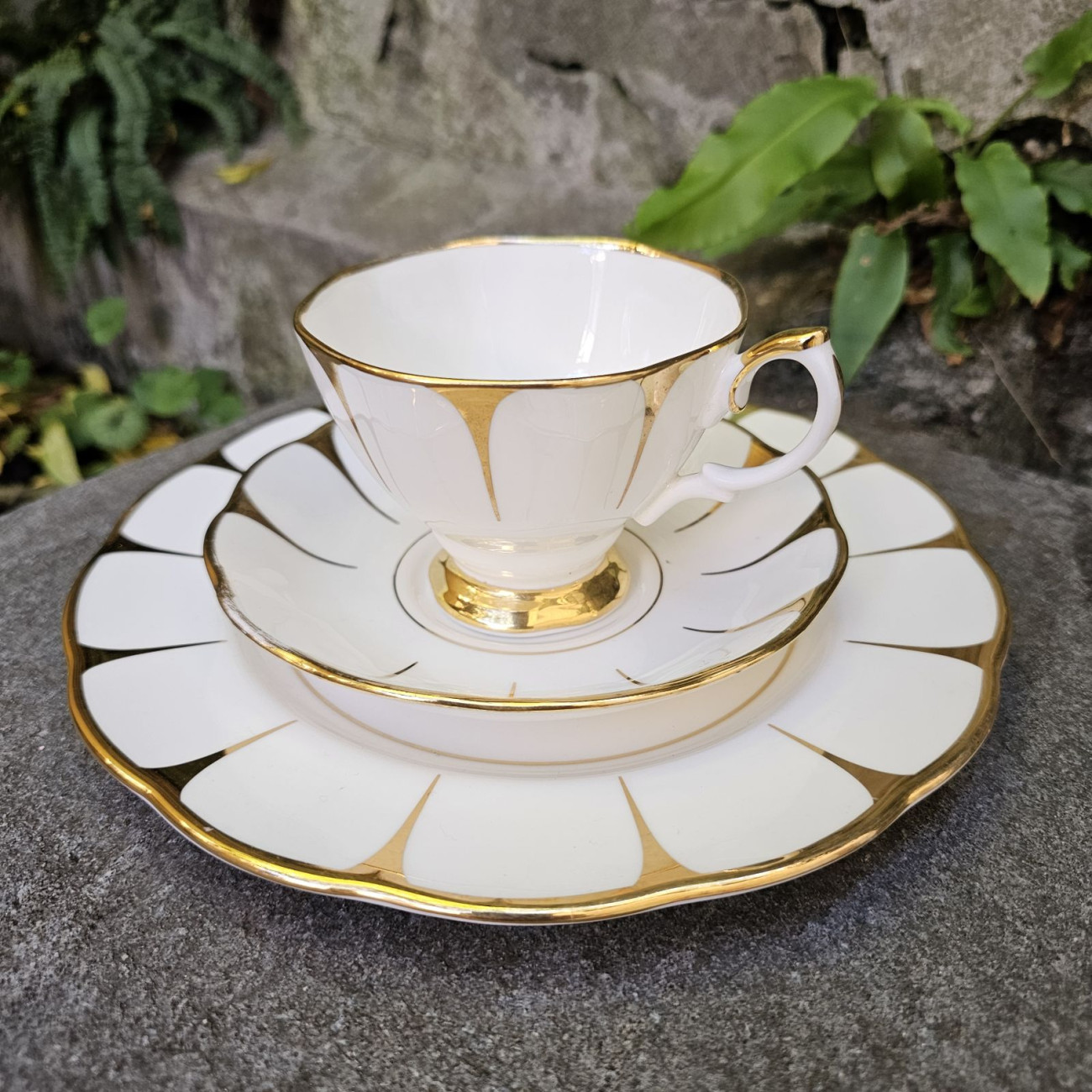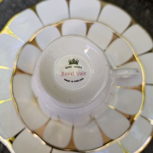 Elegante trio Royal Vale anni ’60 in fine bone china: tazza, piattino e piatto da dolce. Porcellana bianca con ricco decoro in oro.