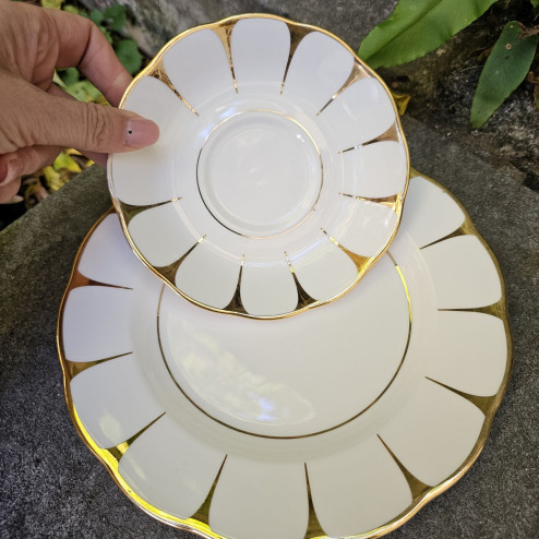 Il servizio è realizzato in una candida porcellana bianca, impreziosita da un raffinato motivo in oro : fasce dorate che scendono dalla tesa della tazza e un elegante decoro radiale su entrambi i piattini, che richiama i petali di un fiore stilizzato. La doratura è brillante e in bellissime condizioni.