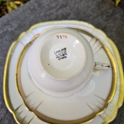 Il marchio LAWLEYS NORFOLK POTTERY, STOKE è impresso sotto la tazza, insieme alla numerazione dipinta a mano tipica del periodo.