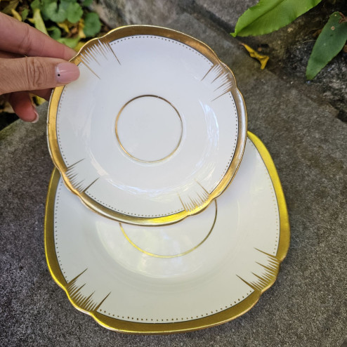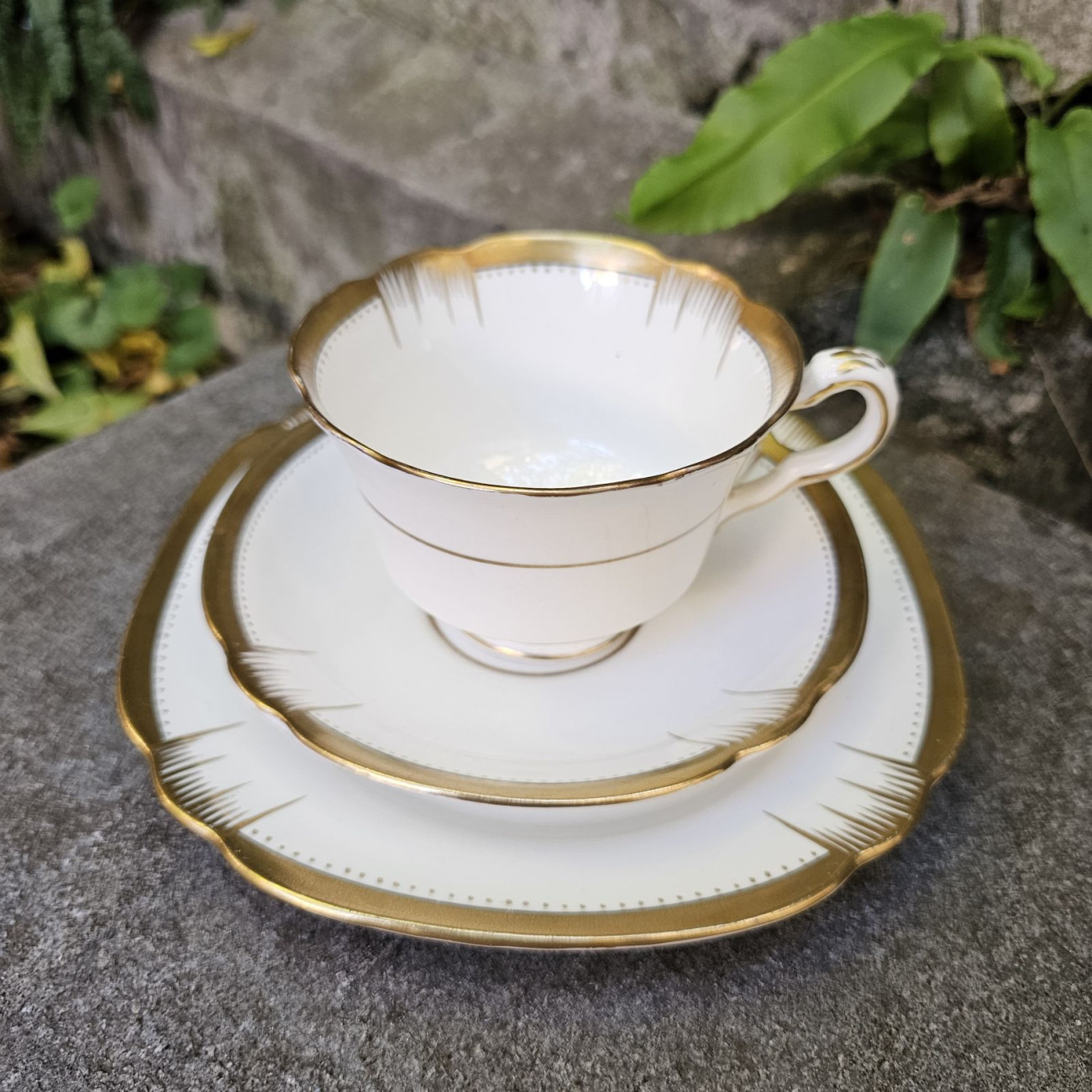 Raffinato trio da tè composto da tazza, piattino e piatto da dolce, prodotto negli anni ’40 dalla manifattura inglese Lawleys, nota per le sue porcellane eleganti e di qualità.