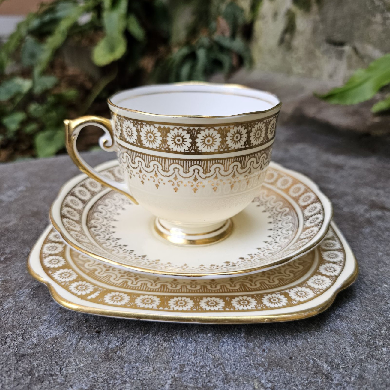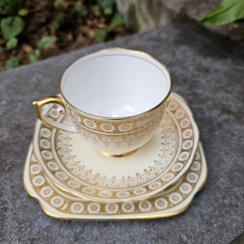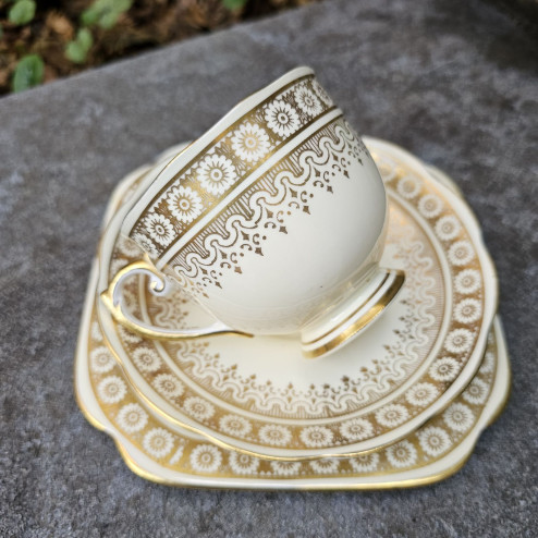 Elegante trio in porcellana fine bone china inglese, composto da tazza da tè, piattino e piatto, prodotto dalla manifattura Roslyn China tra il 1941 e il 1950.