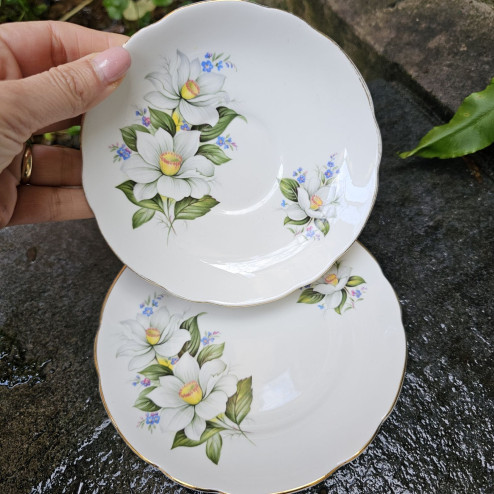 Motivo Floreale: Grandi narcisi bianchi dai dettagli gialli e arancio, accompagnati da piccoli fiori azzurri (nontiscordardimé). Il narciso, simbolo di rinascita e primavera, è reso con grande realismo e colori vividi.