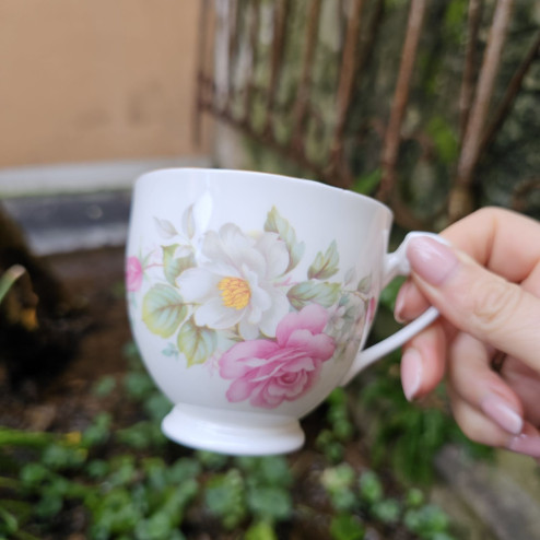 Forma: La tazza presenta una linea "Montrose" leggermente svasata, poggiata su un piede ad anello dorato che ne slancia la figura.