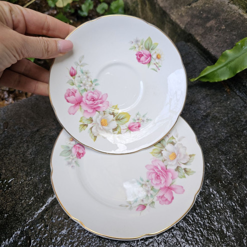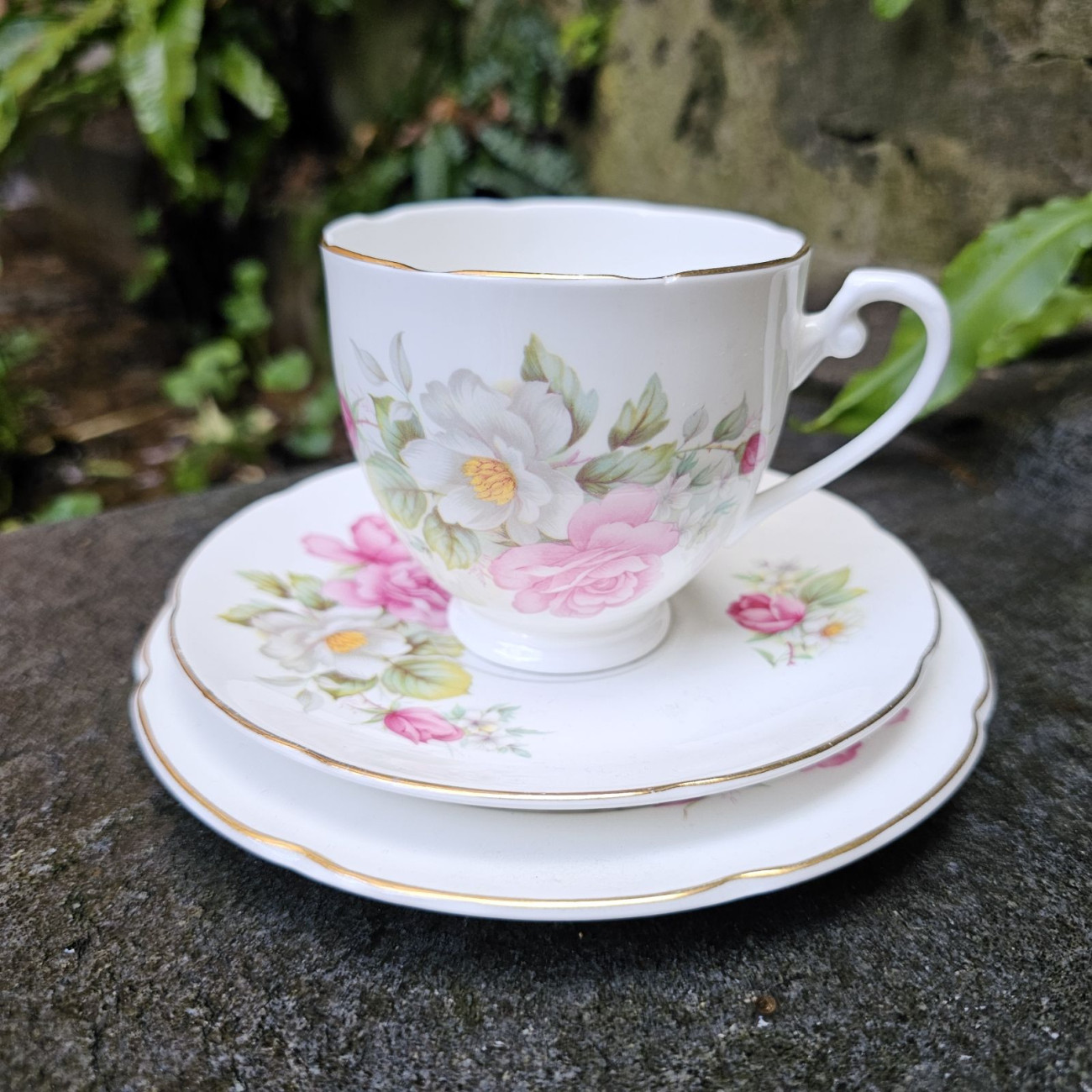 Decoro Floreale: Una composizione di rose selvatiche bianche e rose rosa tea domina ogni pezzo del set. Il disegno è ricco di sfumature delicate, con foglie verdi sapientemente sfumate che donano profondità al bouquet.