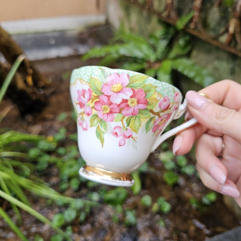 Raffinata tazza da caffè demitasse Coalport in fine bone china inglese, anni ’50, con romantico decoro floreale Junetime e profili dorati.