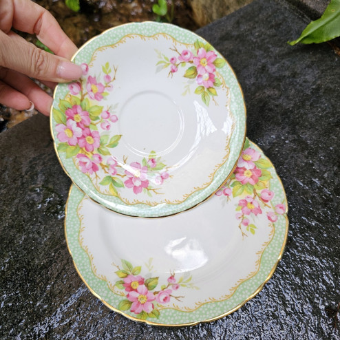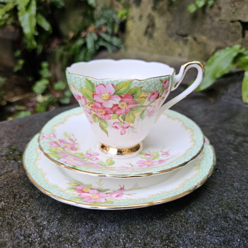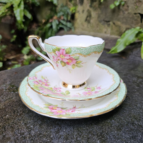 Elegante set "trio" Vintage composto da tazza e doppio piattino in pregiata porcellana Fine Bone China, prodotto in Inghilterra da Newlyn negli anni '50. Caratterizzato da una raffinata forma a calice e decori floreali delicati, questo set rappresenta perfettamente lo stile sobrio e aggraziato del dopoguerra inglese.