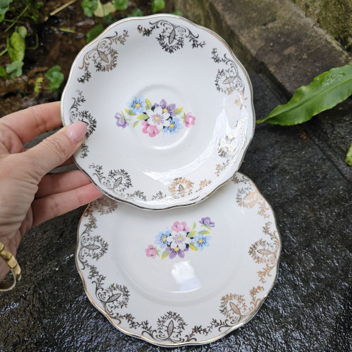 Deliziosa tazza con doppio piattino in genuine bone china inglese, risalente agli anni ’70. La forma classica con piedino centrale dona slancio ed eleganza, mentre la decorazione dorata si combina armoniosamente con i piccoli mazzolini di fiori multicolore, creando un insieme fresco, allegro e decisamente primaverile.