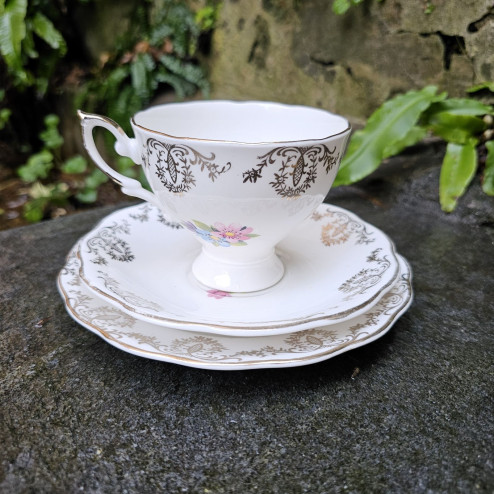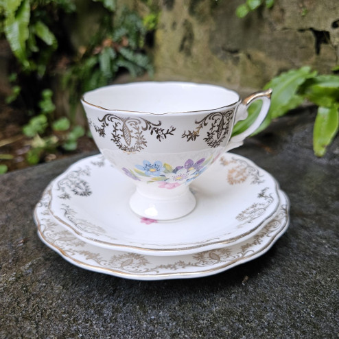 Graziosa tazza con doppio piattino in genuine bone china inglese, produzione Vintage anni ’70. Piedino centrale, decorazione dorata e mazzolini di fiori multicolore. Ottime condizioni.