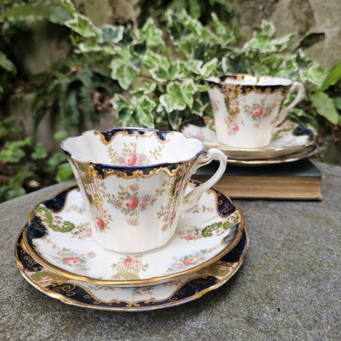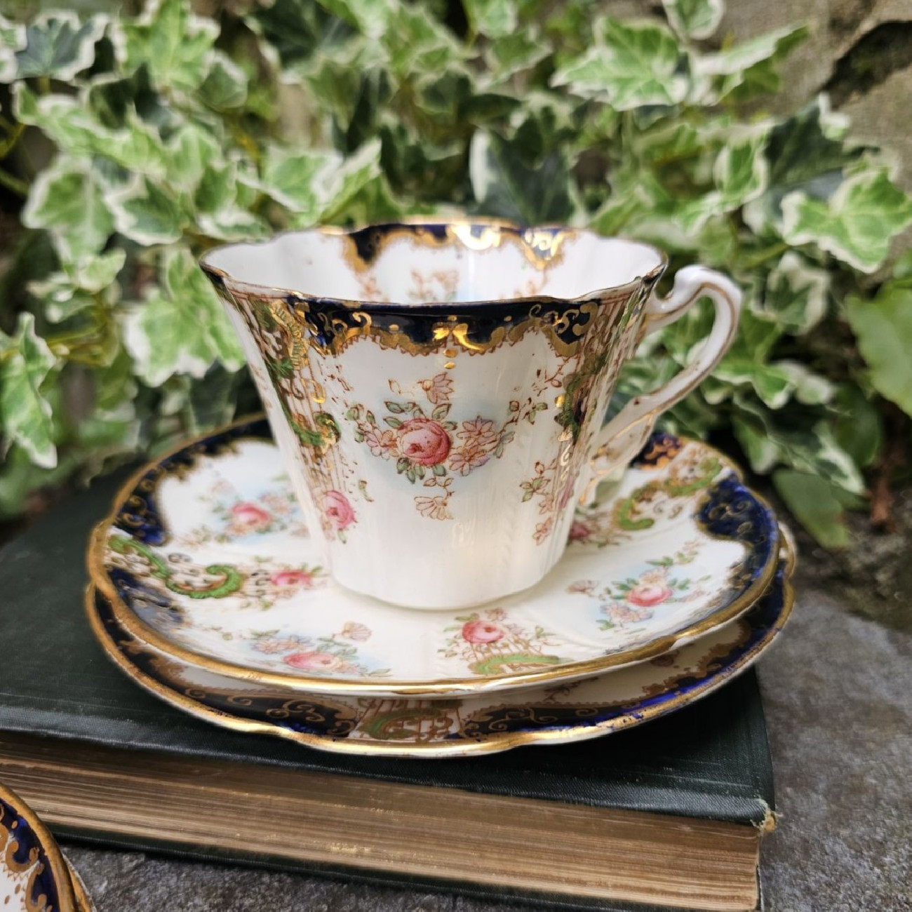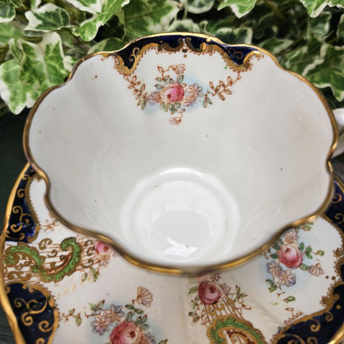 Il decoro è un elegante connubio tra motivi floreali dipinti — rose rosa su sfondo bianco avorio con fiori bianchi e fogliame verde — e ornamenti dorati a intreccio, medaglioni e volute in stile tardo-vittoriano / Edwardiano. I bordi in blu cobalto intenso con finiture in oro lucido conferiscono al pezzo un carattere aristocratico e prezioso. La decorazione si ripete in modo armonioso su tazza, piattino e piatto da dolce, tutti e tre della stessa serie.
