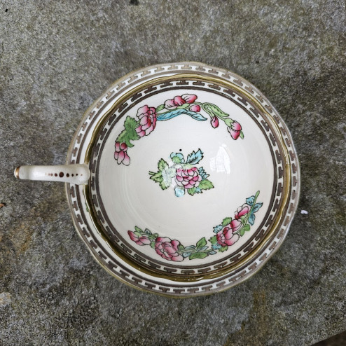Questa elegante tazza da tè con piattino in fine bone china, prodotta dalla storica manifattura inglese Coalport negli anni ’20, rappresenta perfettamente il gusto raffinato della tavola inglese del primo Novecento.