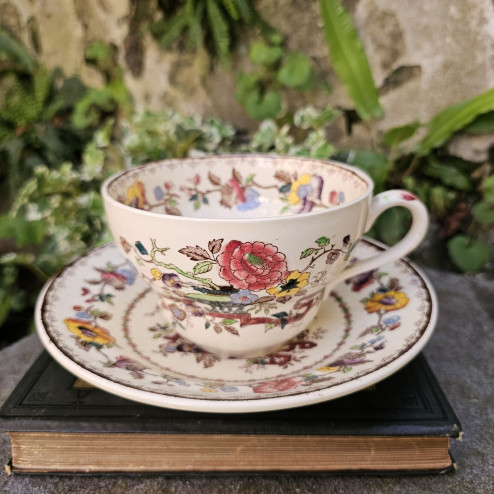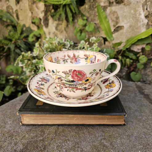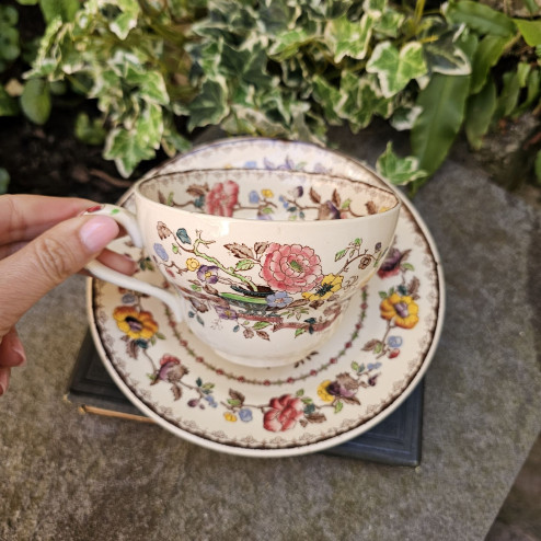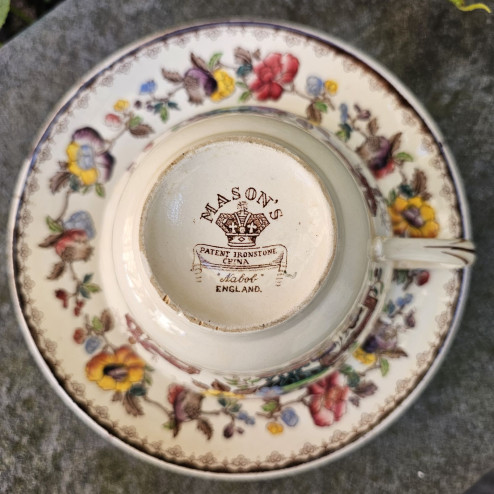 Il decoro Nabob, tra i più ricchi e ornamentali della produzione Mason’s, si ispira all’estetica orientale reinterpretata secondo il gusto inglese dell’epoca. La composizione è vivace e armoniosa: fiori policromi, rami sinuosi e dettagli decorativi si sviluppano attorno alla tazza con colori brillanti – rosa, giallo, blu e verde – incorniciati da sottili bordure.