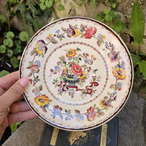 Al centro del decoro si distingue una tipica scena con vaso e motivi stilizzati, elemento ricorrente nei pattern di ispirazione “chinoiserie”, molto amati nelle tavole inglesi tra fine Ottocento e primi decenni del Novecento.