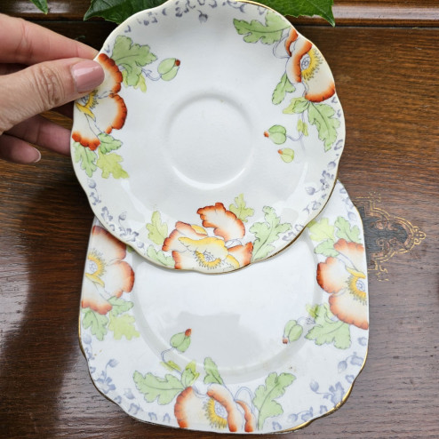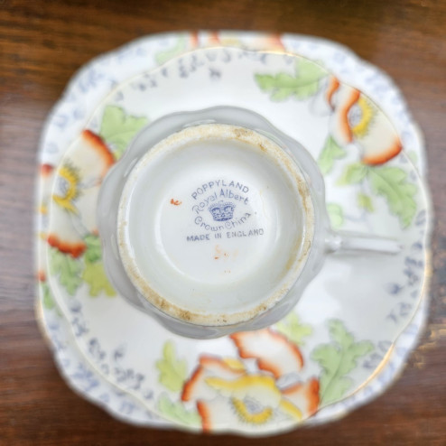 Tazza da tè con due piattini in porcellana fine bone china prodotta in Inghilterra da Thomas C. Wild con il celebre marchio Royal Albert tra il 1925 e il 1937. Decoro floreale “Poppyland” dai colori delicati e profili dorati. Ottime condizioni.