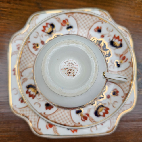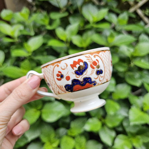 Tazza da tè con due piattini in porcellana fine bone china prodotta in Inghilterra da A.B. Jones con il marchio Royal Grafton negli anni ’30. Decorazione nei colori tipici dello stile Imari con blu, rosso e oro. Porcellana sottilissima e tazza con elegante piedino. Ottime condizioni.