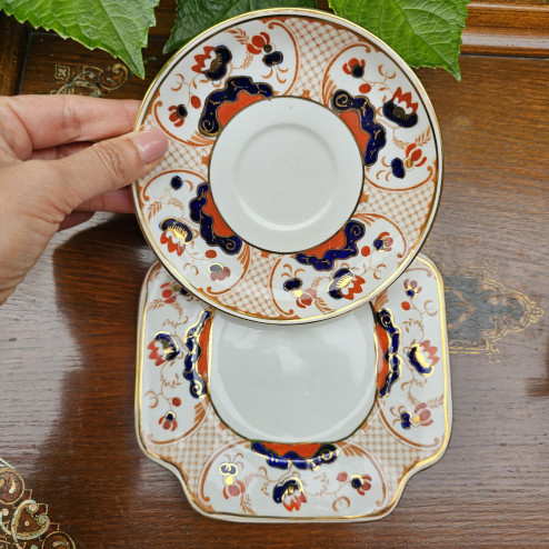 Il servizio presenta una raffinata decorazione ispirata allo stile Imari, caratterizzata dalla combinazione classica di rosso ferro, blu intenso e oro, colori che richiamano le celebri porcellane giapponesi esportate in Europa tra XVII e XVIII secolo e che furono ampiamente reinterpretate dalle manifatture inglesi.